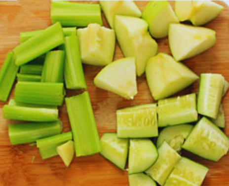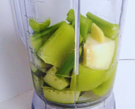 - Add cucumber, celery, apple and ginger to a blender