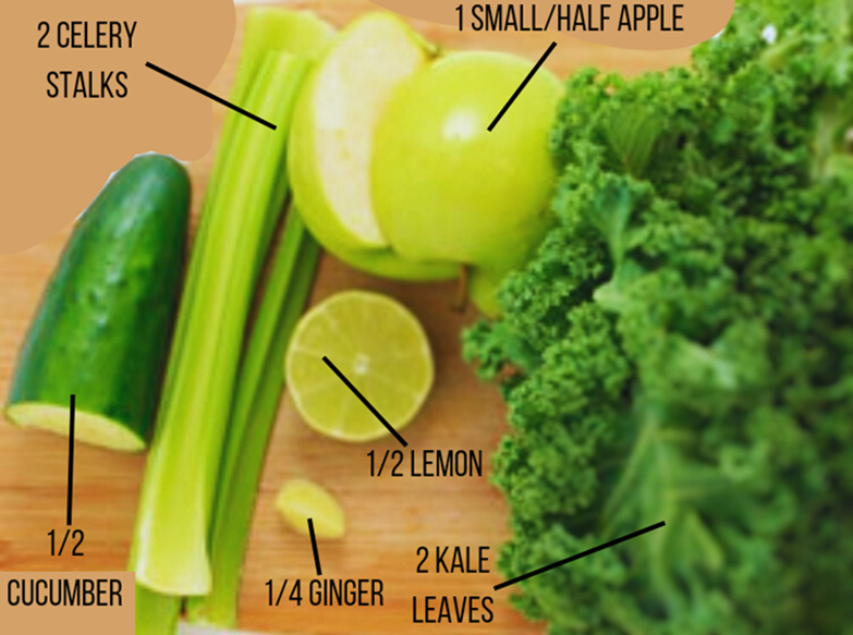 The ingredients include leafy greens like spinach or kale, other vegetables like celery and carrot, combined with other healthful ingredients like ginger, lemon or turmeric.