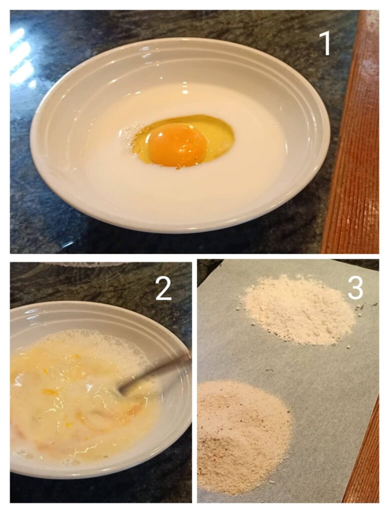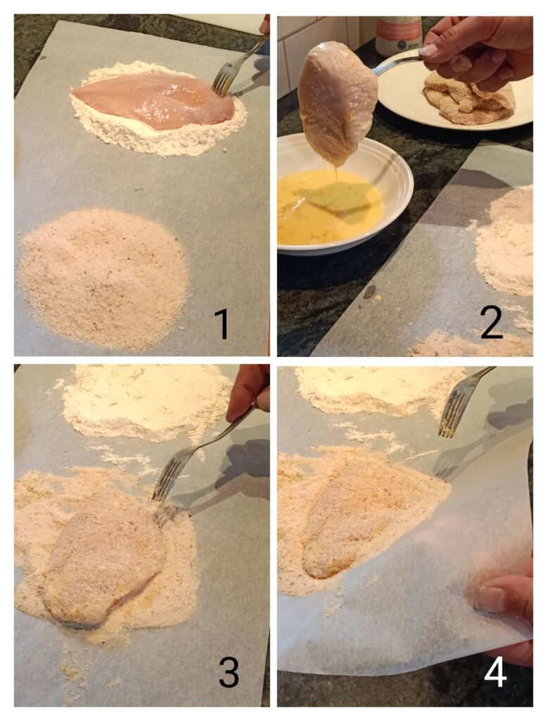 - Using a fork, tongs or your hands, coat the schnitzel first in flour