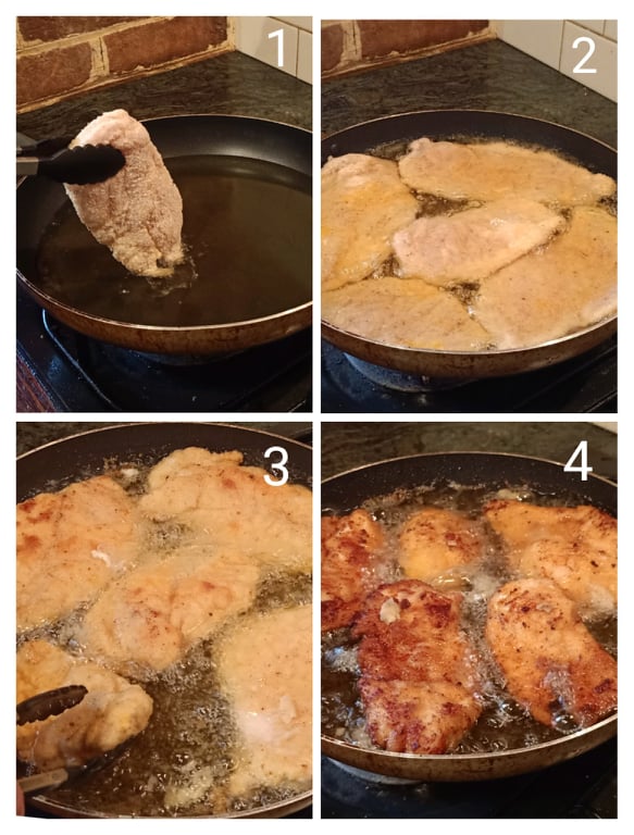 - Add the schnitzel pieces to a saucepan with a generous amount of oil for frying (make sure the oil is hot, using a pinch of breadcrumbs which fizzle)