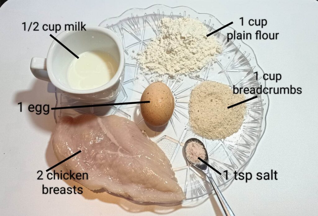 - Next, coat the chicken in breadcrumbs