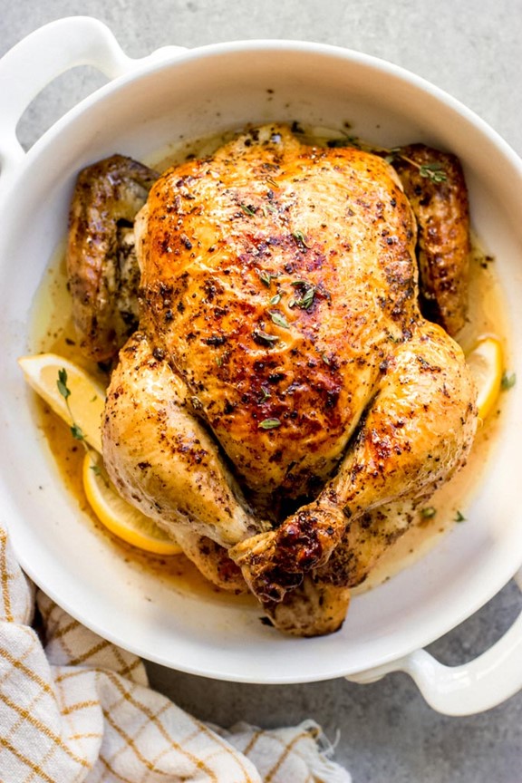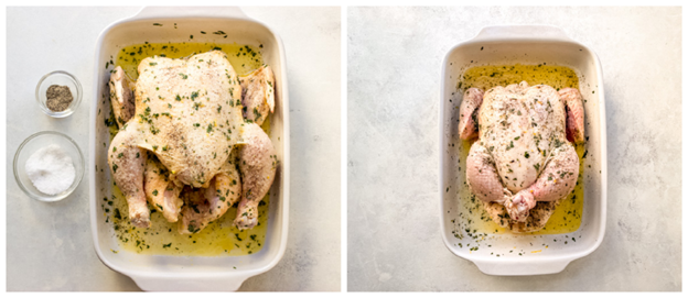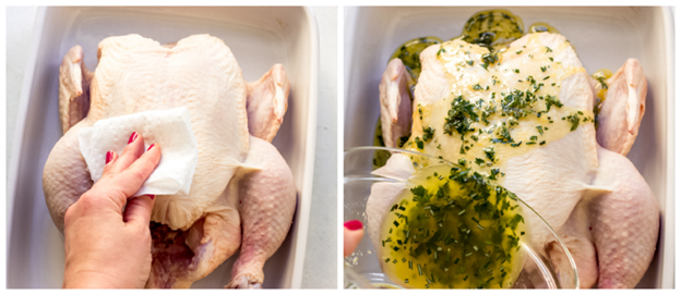 • Pat dry with paper towels and pour the mixture over the chicken, covering all of it, including inside the chicken cavity