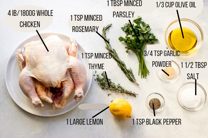 • When ready to roast, uncover chicken, tie the legs together and roast 1 hour at 425F / 220C.  Let rest 10-15 minutes before serving.