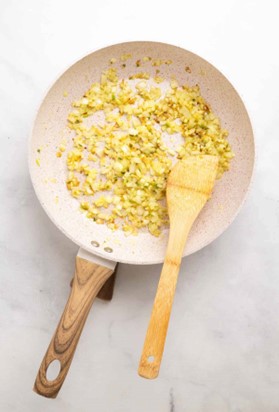 - In a pan, melt butter. Add onions, ginger, garlic and chili and fry for 5 minutes.
