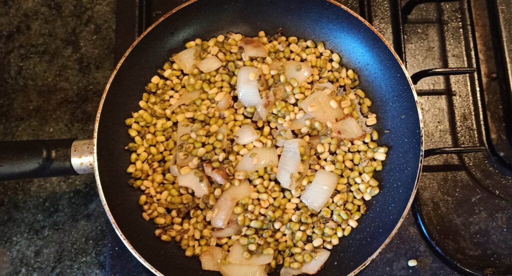 - Add chilli and corriander – cumin powder to the onion, followed by the cooked mung beans