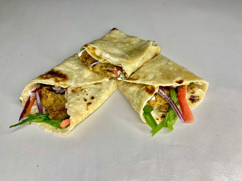 - Carefully roll up the stuffed tortilla and cut in half in the centre if desired