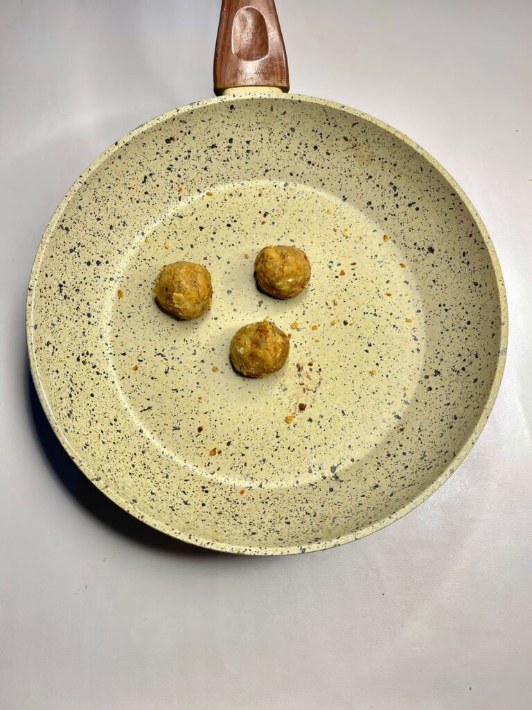 - Place a pan on medium heat and add 2 tablespoons of oil. Once the oil is hot, and add the raw falafel balls and shallow fry until they turn crunchy and brown on both sides.