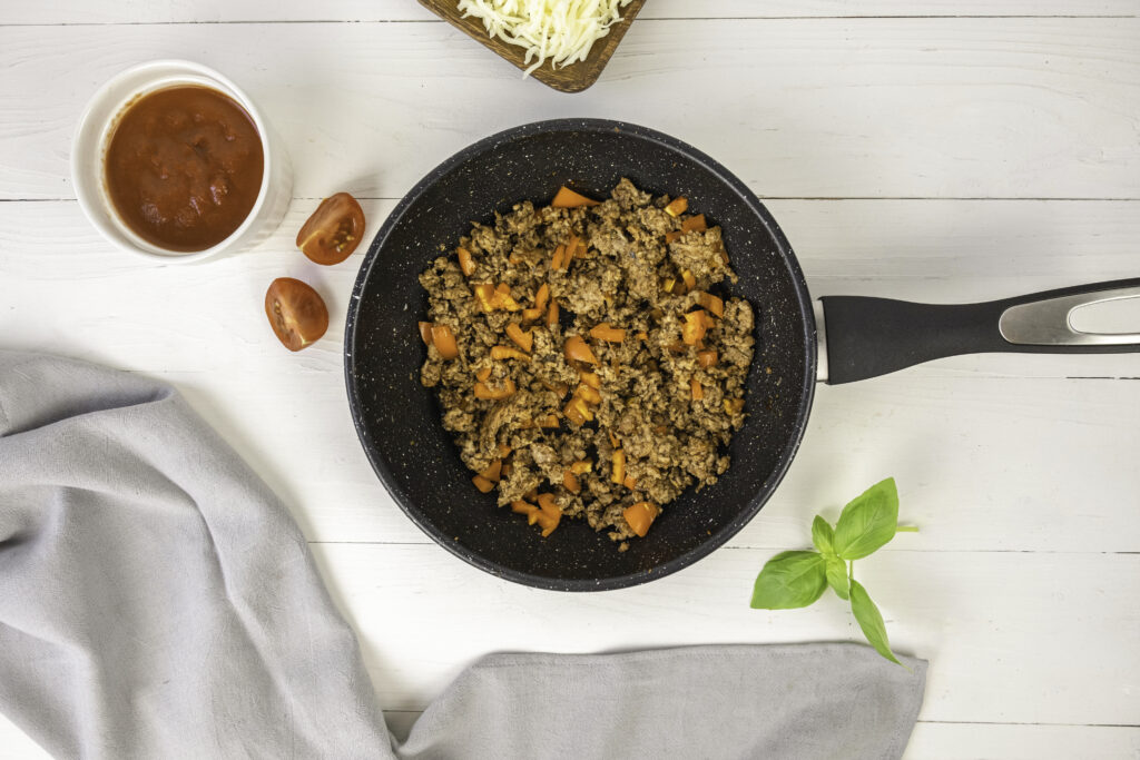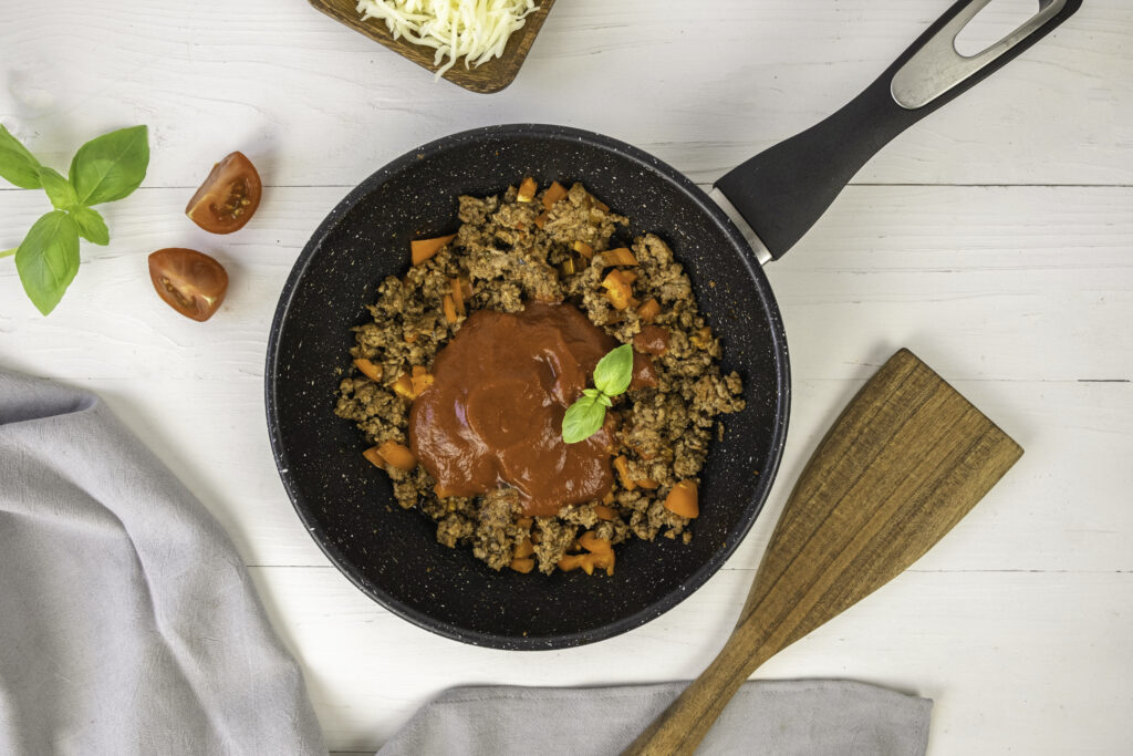 - Cook ground meat and chopped carrot in olive oil in a saucepan